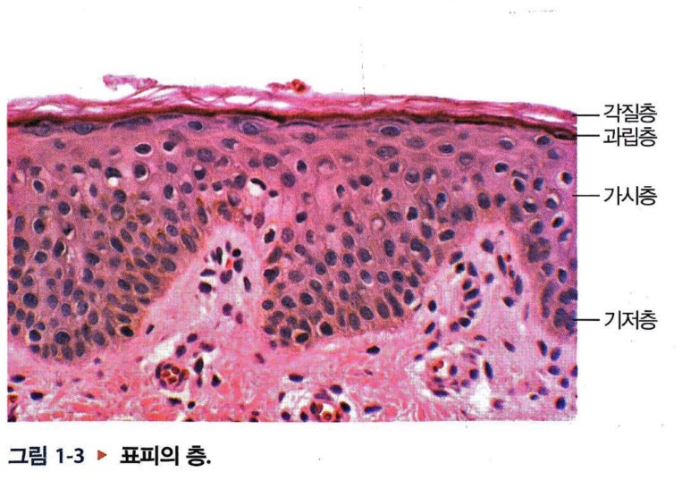 각질층(S.corneum), 과립층(S.granulosum), 가시층(S.spinosum), 기저층(S.basale)