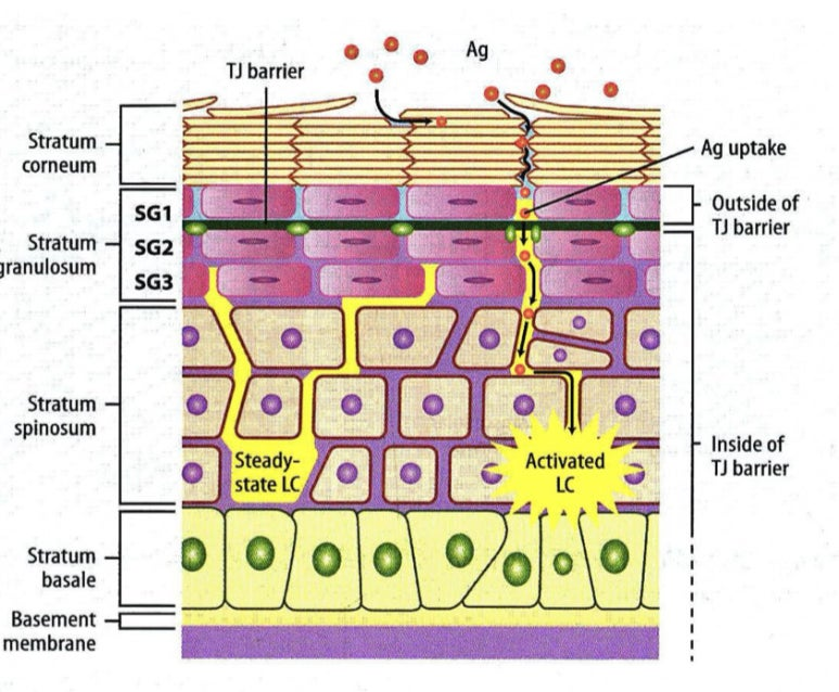 그래서 피부에 무언가 닿거나 발랐을 때, 최대한 어떻게든 흡수가 안되게 위와 같이 정말 여러 barrier들로 둘러 쌓여 있죠. (자세한 내용을 다루는 건 여기서 의미가 없지만, occludin, JAM-A, treicellulin, angulin 등으로 이루어진 tight junction이 SG2 층에서 각질층 장벽을 형성하고, 층판소체로부터 분비된 지질은 각질지질외피 위 지질층판을 이뤄서 세포 간 공간에서 수분이 통과할 수 없는 각질층 장벽을 이룹니다.)