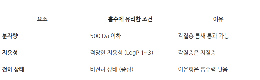 경피내 흡수(transcutaneous absorption)에 가장 중요한 것은 아래와 같습니다.