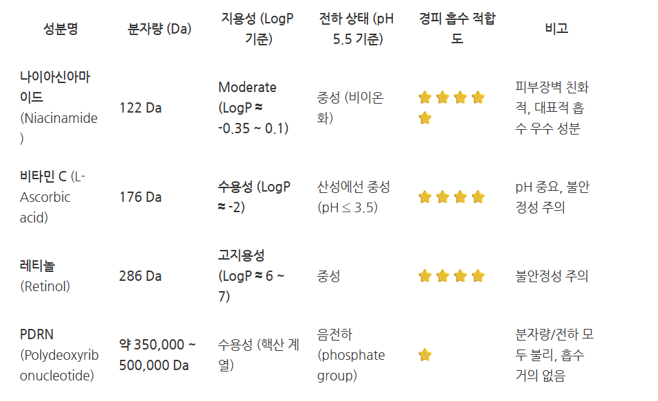 위에서 보면, 나이아신아마이드/레티놀은 모두 분자량/지용성/전하상태 만족하여 피부내 흡수가 잘 된다고 볼 수 있습니다.