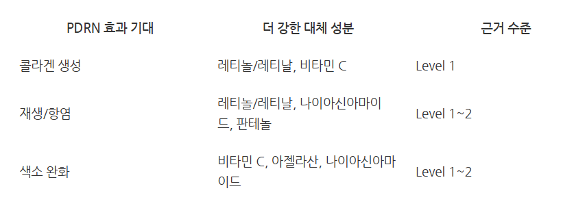 PDRN의 콜라겐 생성, 재생, 항염, 색소완화의 예상 효능을 대체할 수 있는 훨씬 더 높은 수준의 근거를 갖고 있는 아래와 같은 성분들이 이미 있음.