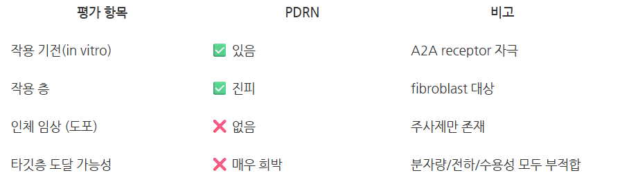 또한, 최근에 어필하는 저분자 PDRN이라 해도 500 Da의 기준에는 미치지 못하고, 수용성/음전하 문제는 해결하기 어려우며, 가장 결정적으로 이 친구의 작용 기전이 진피 내 섬유아세포에 있는 A2A receptor라는 것이 큰 문제입니다.